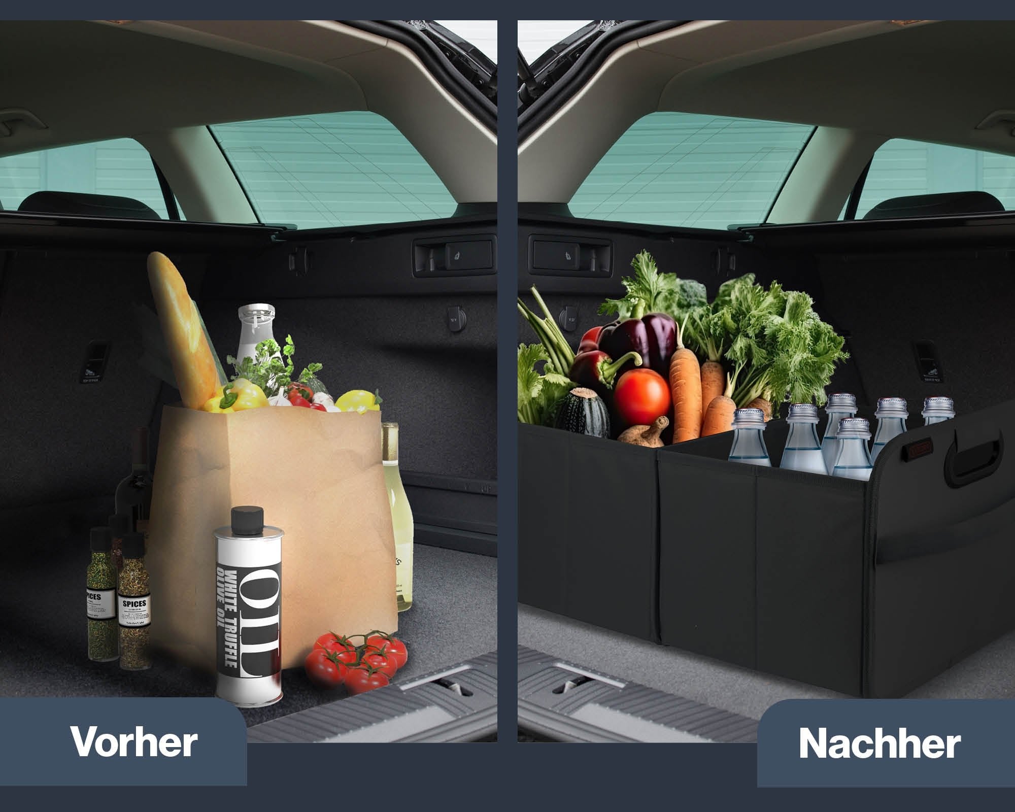 Fühlen Sie sich von einem unordentlichen Kofferraum überwältigt? Unser Kofferraum Organizer bringt sofortige Erleichterung und Ordnung in Ihr Auto. Schauen Sie sich das „Vorher-Nachher“-Bild an und erleben Sie, wie einfach es ist, das Chaos zu besiegen!